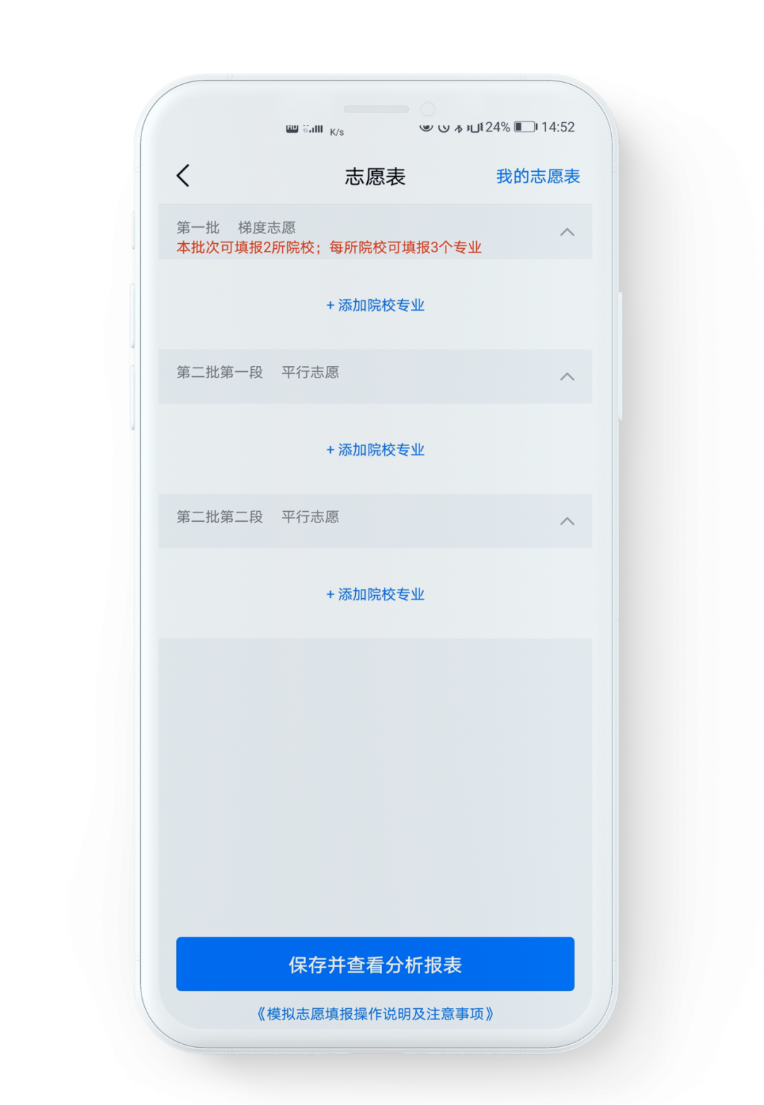 艺术升志愿模拟填报功能实时跟进省考试院公布省份批次投档方式及投档规则为原则,高度模拟正式的志愿填报的院校专业添加流程,告诉考生每个批次可以填报的院校与专业情况。