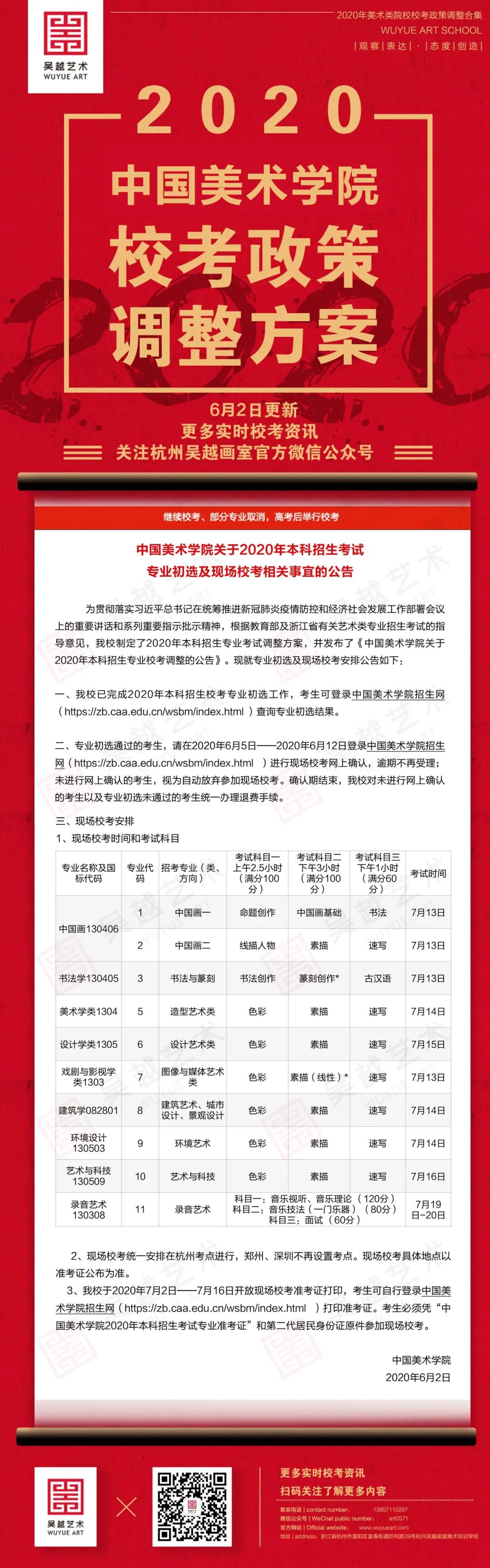 为贯彻落实习近平总书记在统筹推进新冠肺炎疫情防控和经济社会发展工作部署会议上的重要讲话和系列重要指示批示精神,根据教育部及浙江省有关艺术类专业招生考试的指导意见,我校制定了2020年本科招生专业考试调整方案,并发布了《中国美术学院关于2020年本科招生专业校考调整的公告》。现就专业初选及现场校考安排公告如下: