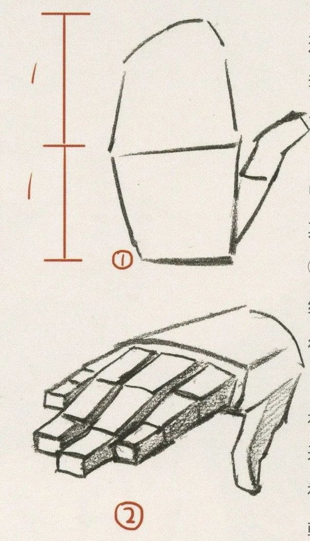 1、手掌可理解为梯形,手指理解为连指手套形,手指与手掌比例为1:1。