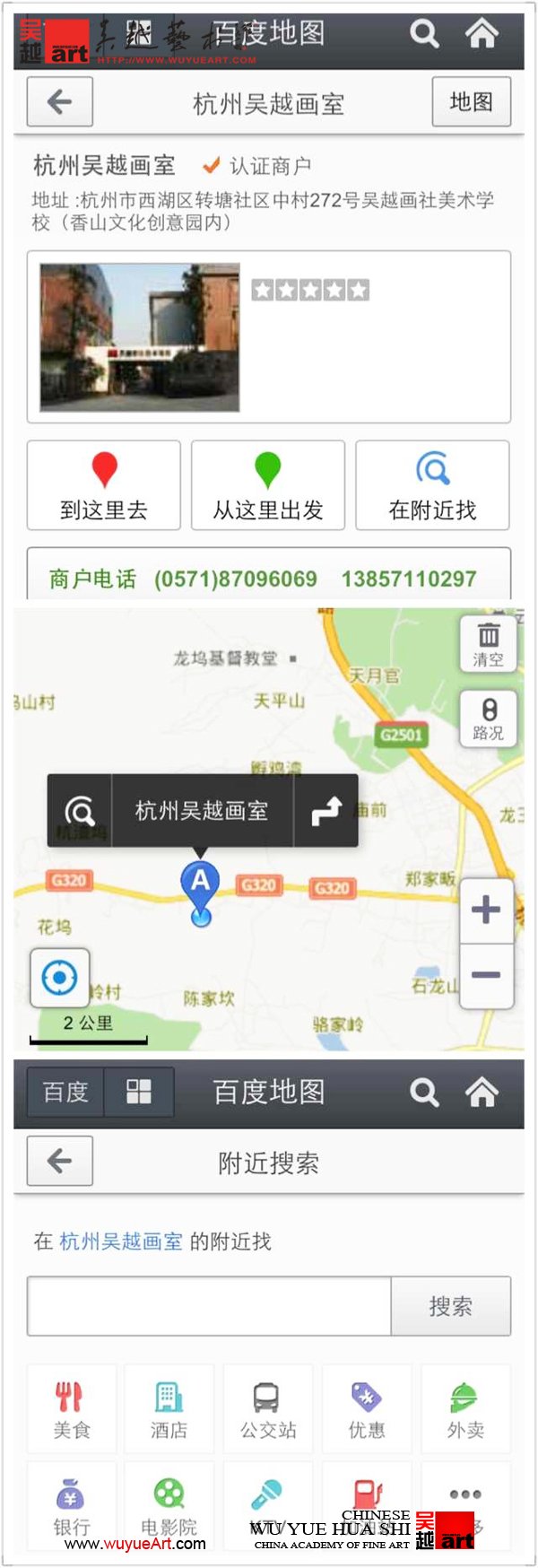 【杭州吴越画室百度地图】 可以查询吴越画室附近公交、周边宾馆、设施等,非常方便。