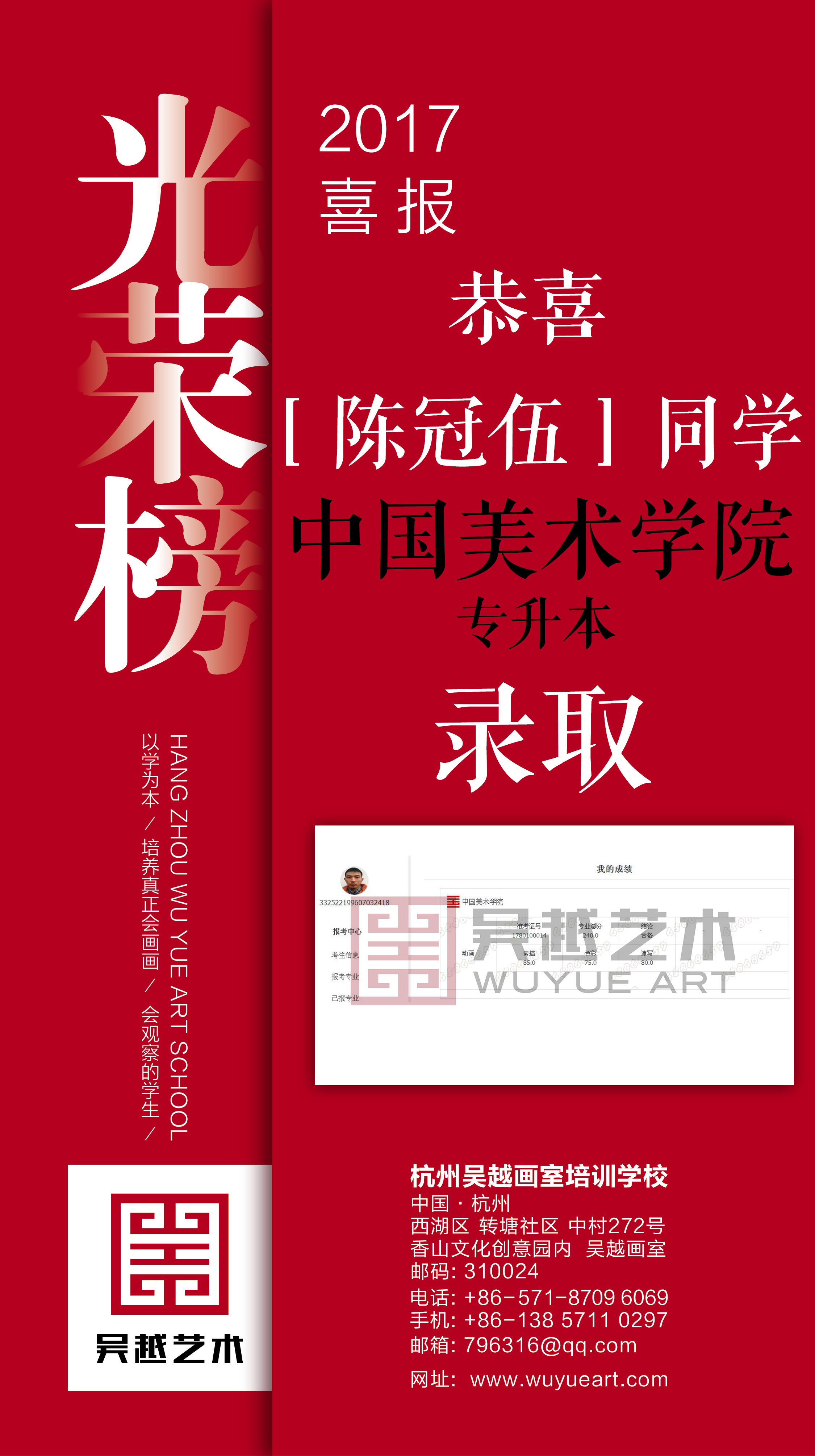 上海大学美术学院成绩刚刚公布,我们的同学频频传来喜讯,吴越的工作人员正在紧锣密鼓地查询和统计分数,在此次考试中,我们的同学取得了可喜的成绩,朱沁格同学上海美术学院浙江省排名第12名,方思恩同学上海美院浙江省排名第15名,王一江同学上海美术学院山东省排名第25名,这是我们同学认真努力得来的,加油,同学们!