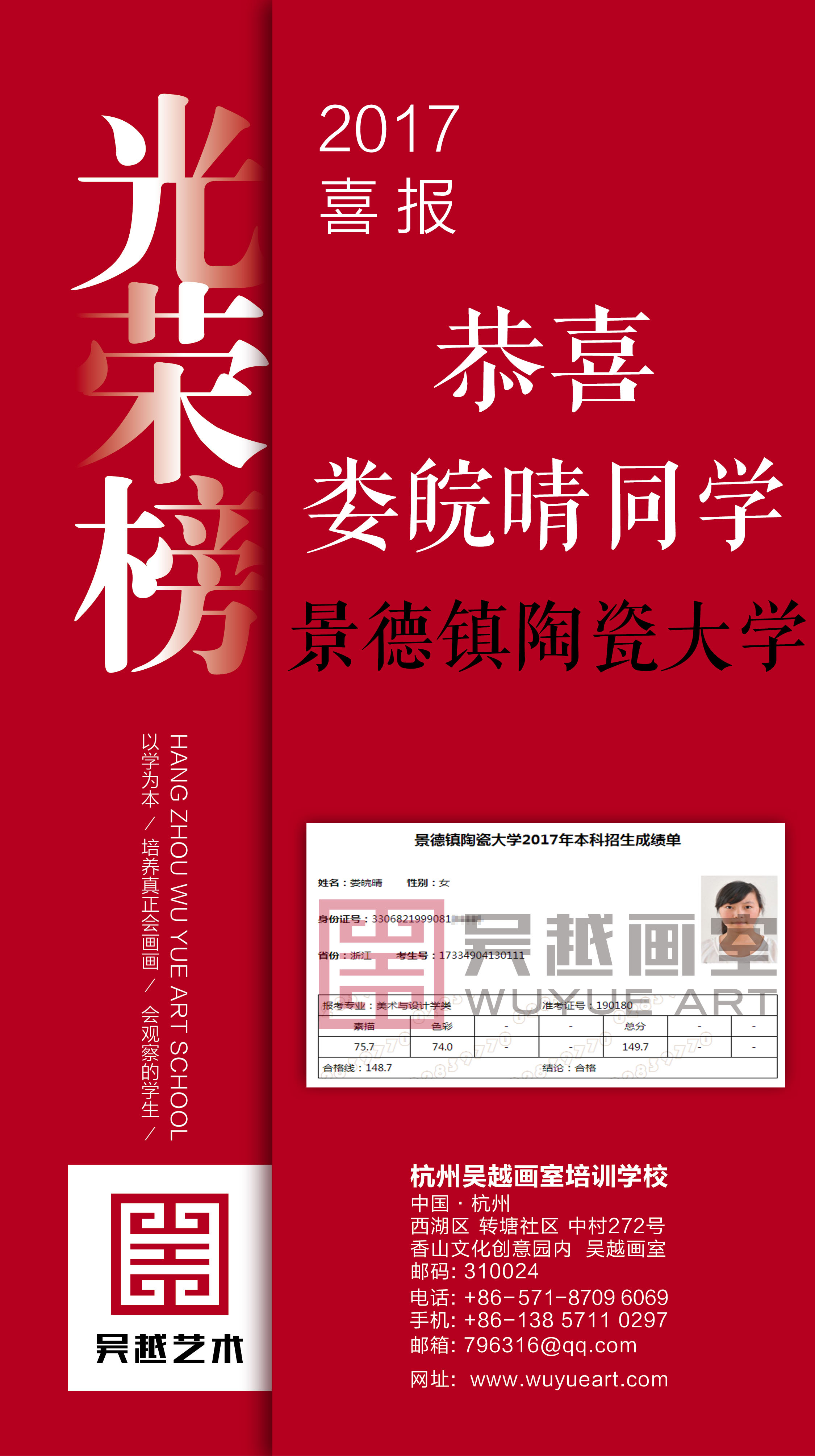 四川美术美术学院,景德镇陶瓷大学,江南大学等学校已经揭晓,余玮菁(港澳台)同学四川美术学院造型专业第3名,闫文卓同学四川美术学院造型专业第24名,陈泳羽同学四川美术学院设计专业第10名,雷佩霖同学四川美术学院设计专业第11名,张虎同学四川美术学院设计专业第19名.....我们同学们从全国众多学生之中脱颖而出,这是一个令人可喜的成绩,小编在这里不一一列举了,祝贺同学们,在接下来的文化学习中,继续加油,同学们,你们是最棒的!
