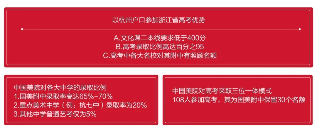 一经杭州高校附中录取后可以有学习统一办理临时的杭州市集体户口,考生将会以杭州生源身份参加,国美附中考上中国美院等各大名校的概率将会比其他普通类考生高出15倍,让你高考就赢在起跑线上!