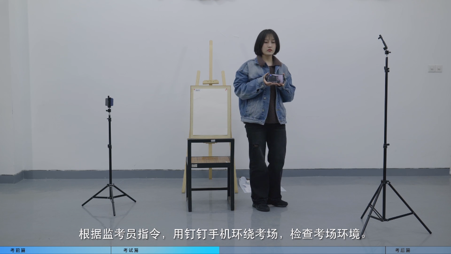 二、考生按照监考员考试指令进入考场。按监考员要求360度展示考场,根据指令展示《准考证》、二代身份证件原件及考试用纸张。
