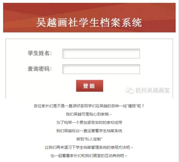 杭州吴越画社学生档案管理系统网页版:访问地址: http://stu.wuyueart.com/ms/index.php ,用户名是您小孩的名字,密码是身份证号码,1.登陆到页面内家长可以看到每次考试的排名及考试作品照片,2.可以查询到学员的奖励和违纪情况,3.可以查询到学员请假情况和请假原由,4.可以通过平台知道学员的各科目任课老师和班主任老师,5.里面有家长提问系统,家长可以对应学员的任课老师提问,了解学员学习动态,6.可以看到每次考试班主任给学员的学习评估情况,以更方便家长及时了解同学们的学习动态和学习情况。