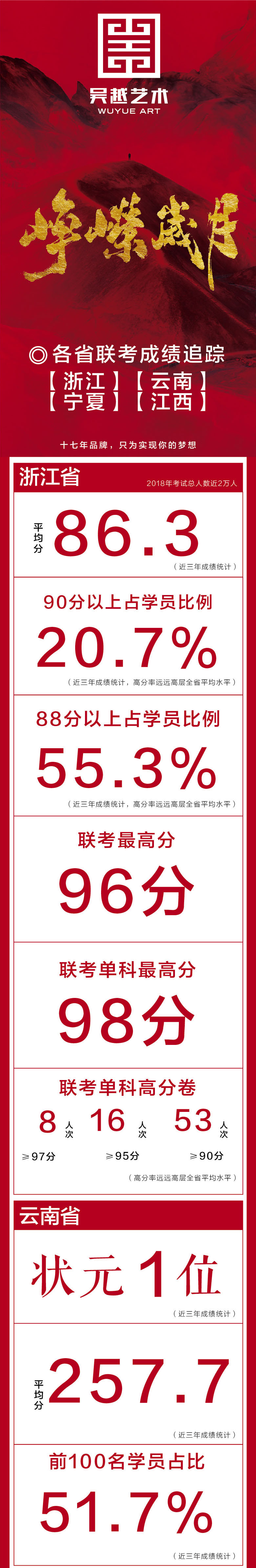 2018年杭州吴越画室:浙江省联考平均分86.3分,90分以上占学员比例20.7%,88分以上占学员比例53.9%,其他各省份联考联考过线率均100%,各省联考均有数位同学摘取省联考前50名。